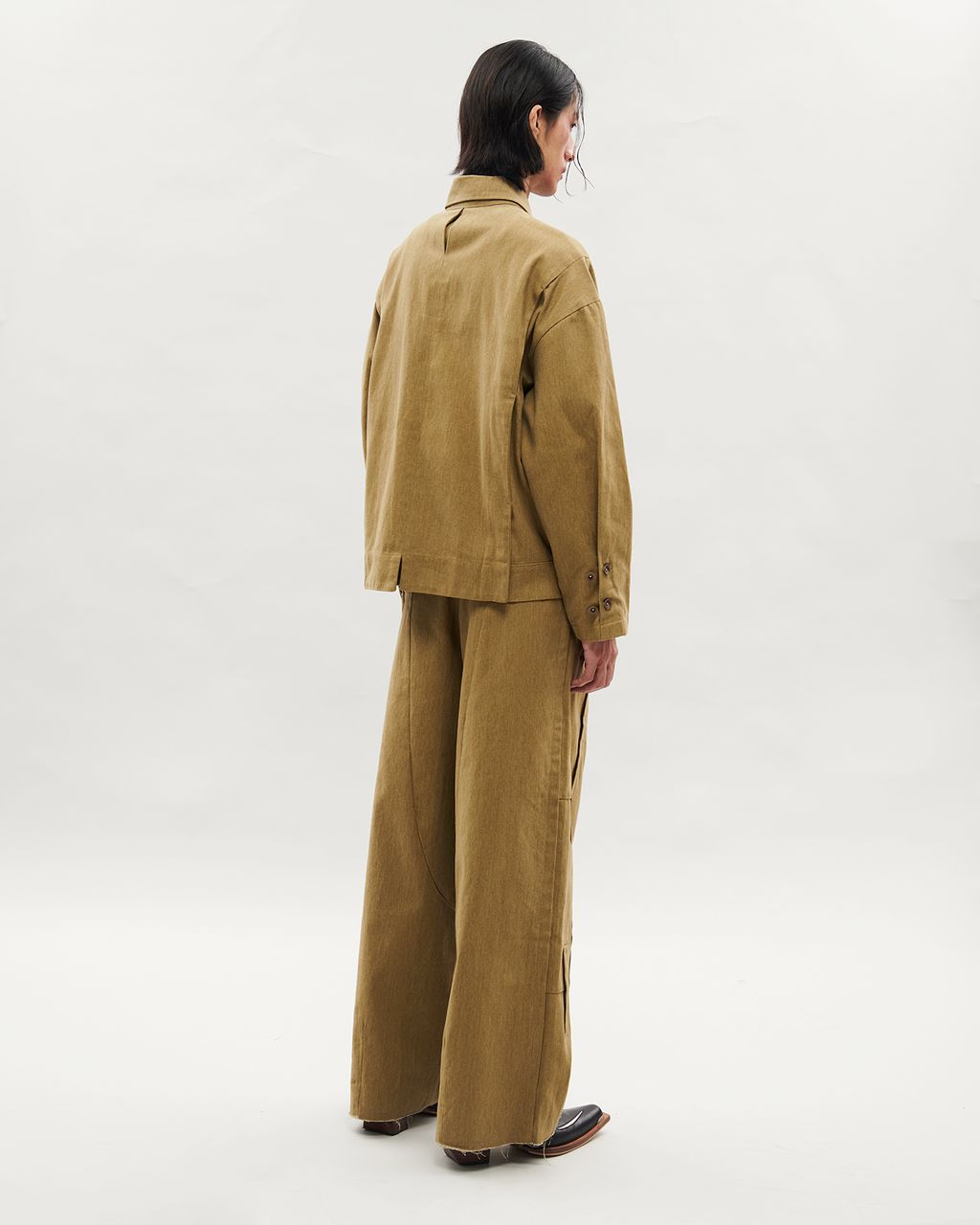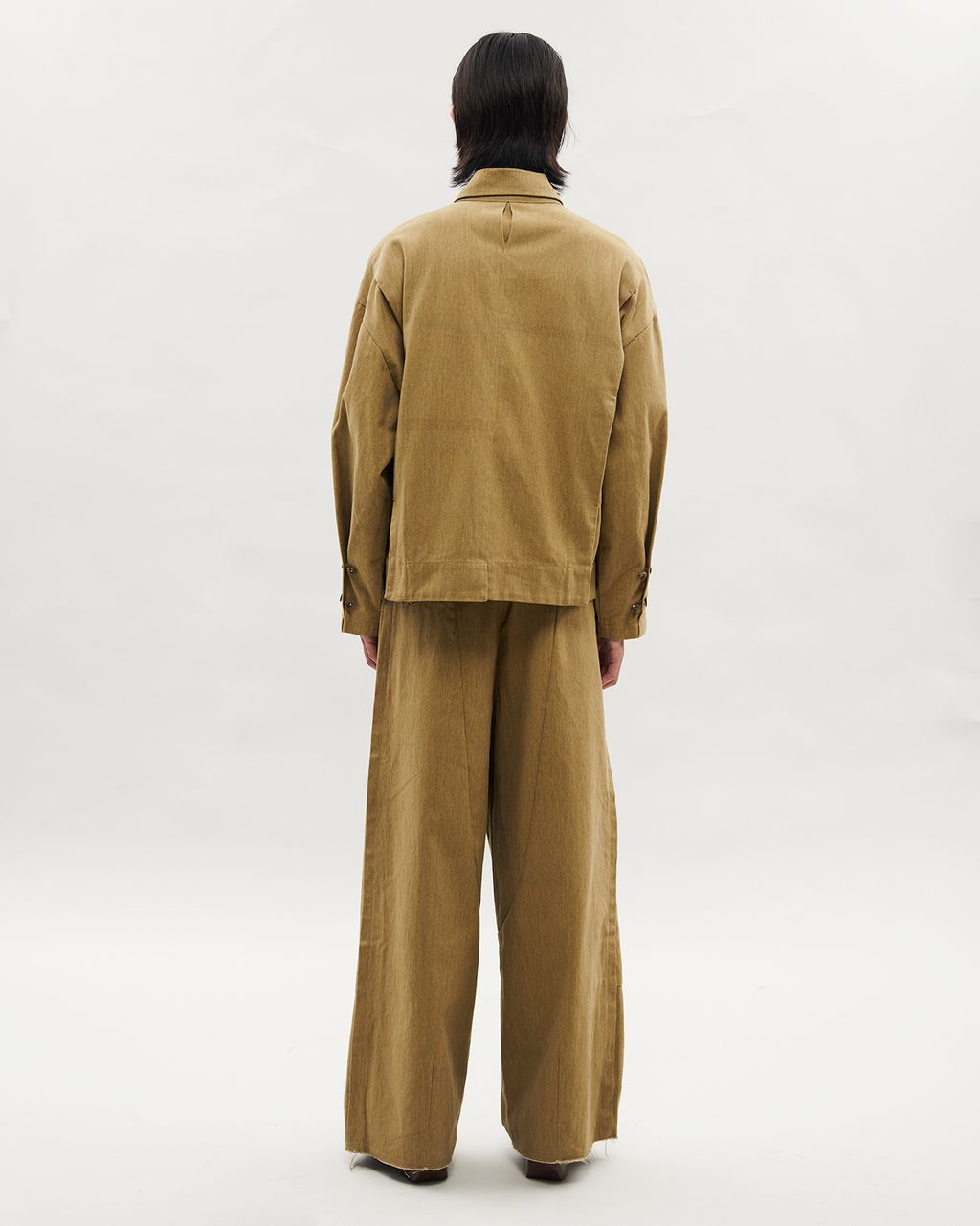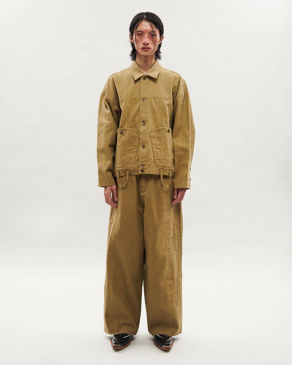 以重磅染洗褪色面料製成,經特殊水洗處理後展現自然的復古舊化質感。版型採寬鬆輪廓為基礎,介於直筒與A字之間,透過厚實硬挺的布料結構,於褲腳底部加入收褶設計,使整體在寬闊線條中仍保有俐落感與份量平衡。