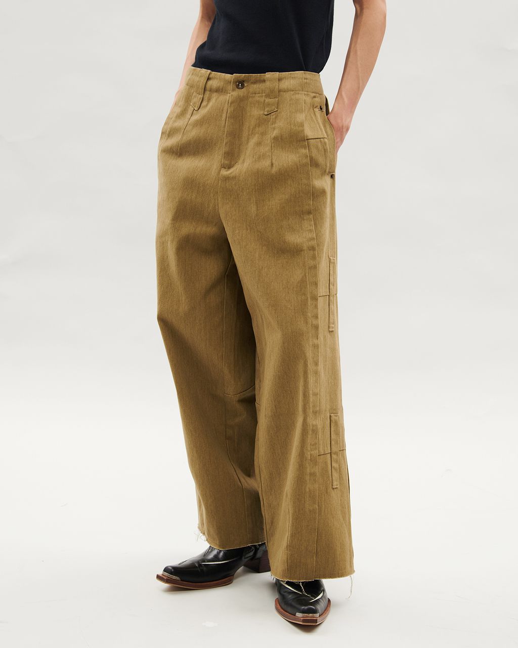 正面設置寬幅斜線褲耳,並於下方加入立體褶摺細節,強化整體的結構層次與立體度。兩側延伸出寬版側條剪接,脇邊開設長型插袋,上下以牛仔卯釘作為裝飾點綴;以相同的插袋袋唇設計向下延伸,新增兩組縱向裝飾結構,並於每一段裝飾上增加一道橫向剪接線,讓整體層次更為豐富,形成連續且有節奏感的視覺效果。