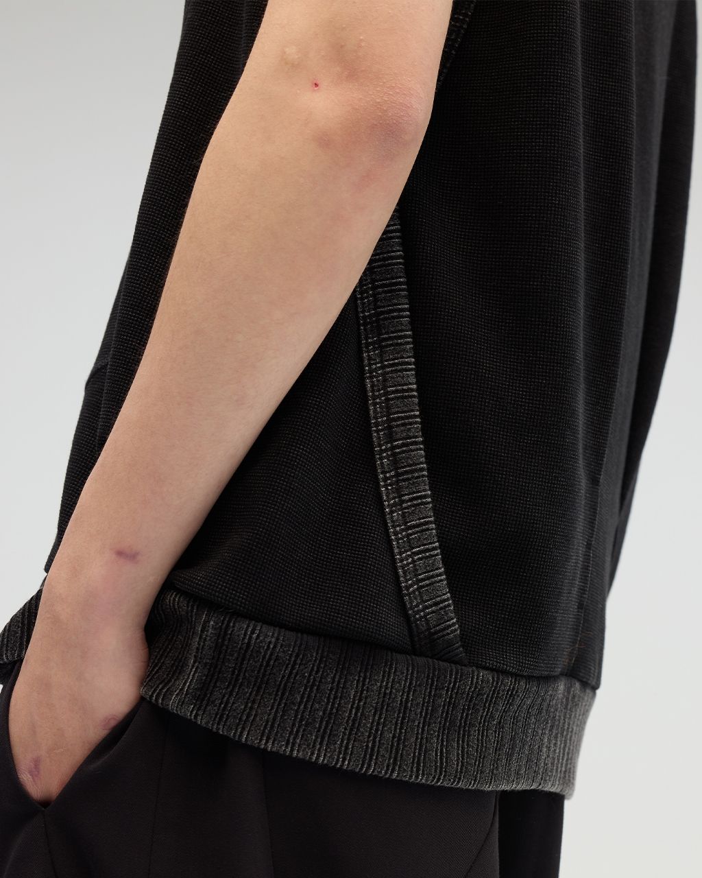 ·領口、袖口與下擺訂製羅紋拼做舊處理