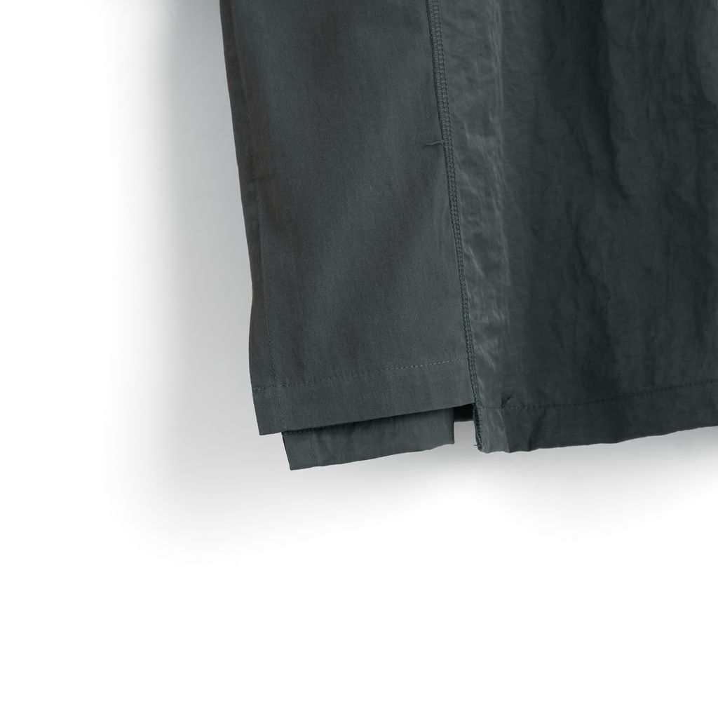 拼接繡花古巴襯衫。使用韓國高品質防潑水機能布料,搭配台灣製純棉布料拼接而成。拼接部分使用裝飾爬線還有不收邊來增加細節。兩側搭配這季的荊棘繡花圖案,呼應著代表恐懼的荊棘概念。一共推出灰色和黑色兩個顏色可供選擇。