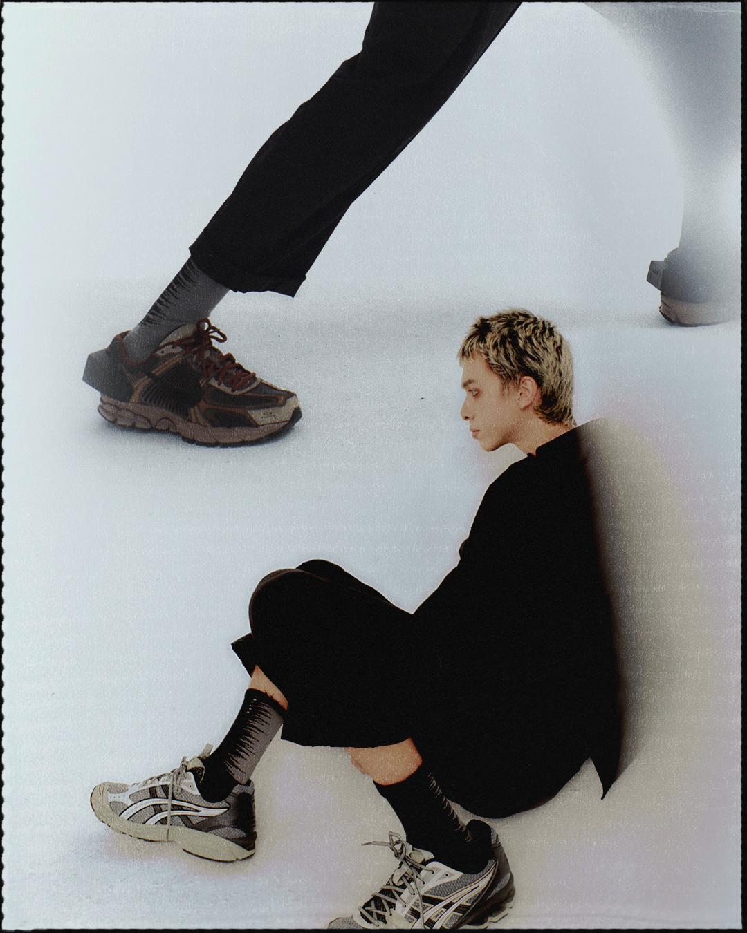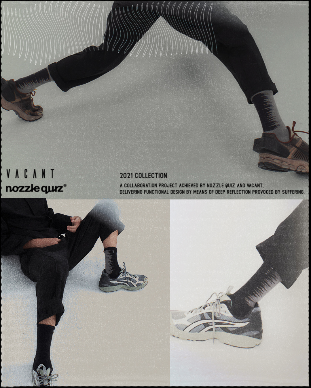 進入秋季之後,nozzle quiz 攜手新銳服裝品牌,以 VACANT 擅長思索痛苦刺激從服裝設計展現的洞見,製作出附有聯名識別印象的襪款。