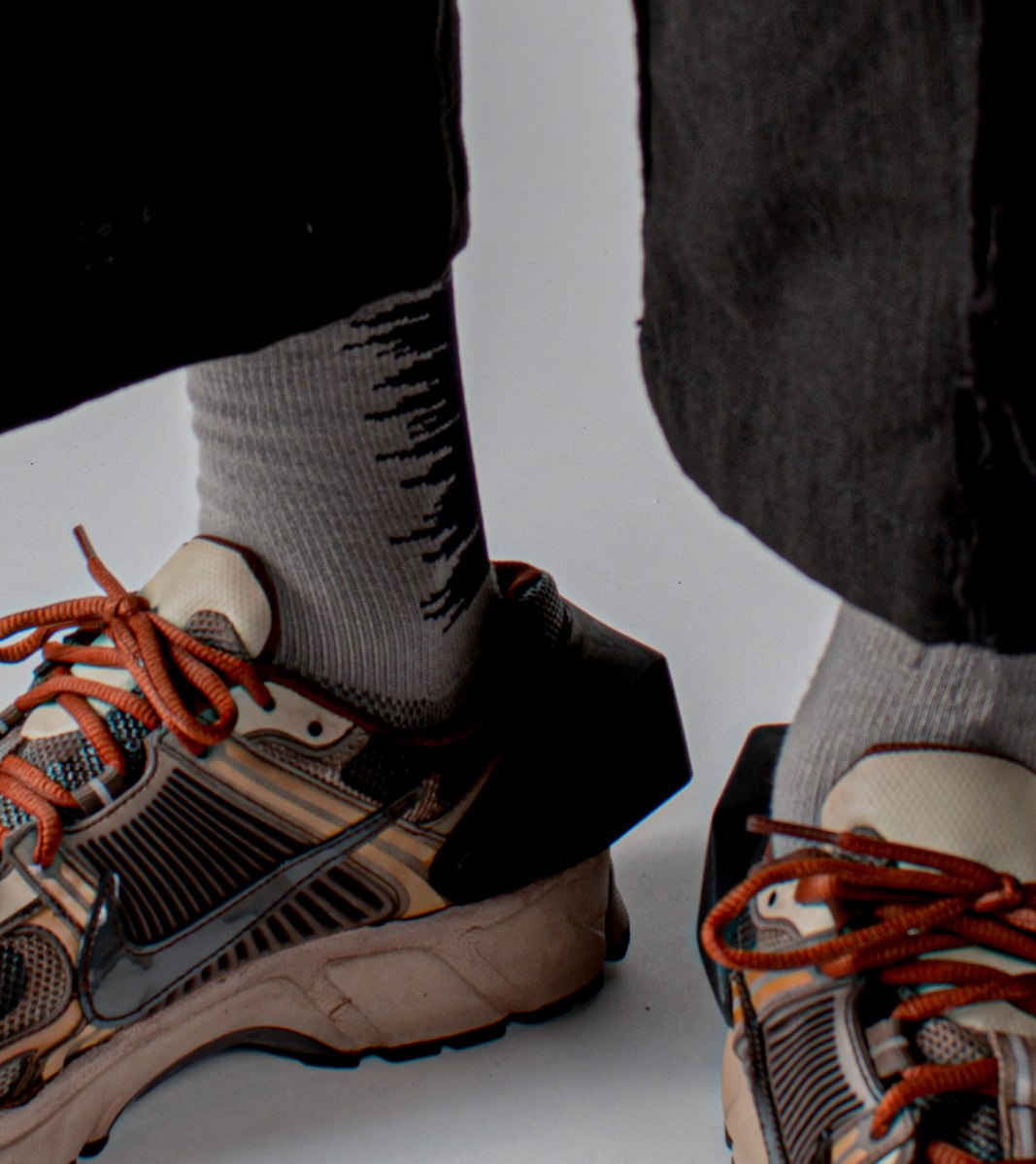 闡述認知與判斷錯誤的「非理性」結果,是由人類偏見與主觀感受差異造成,並將思緒化作起伏的不規則線條,建構出如雜訊般的識別圖像表現於襪履之中。