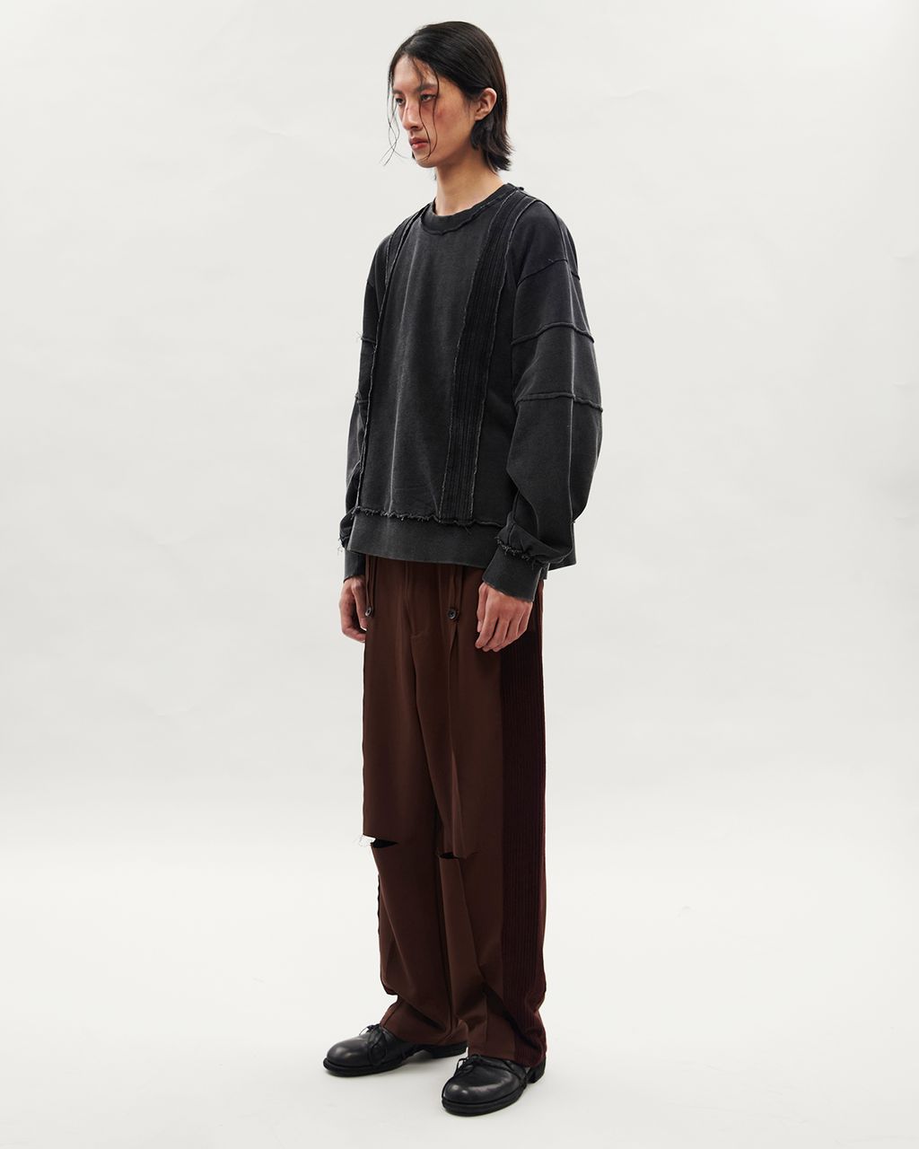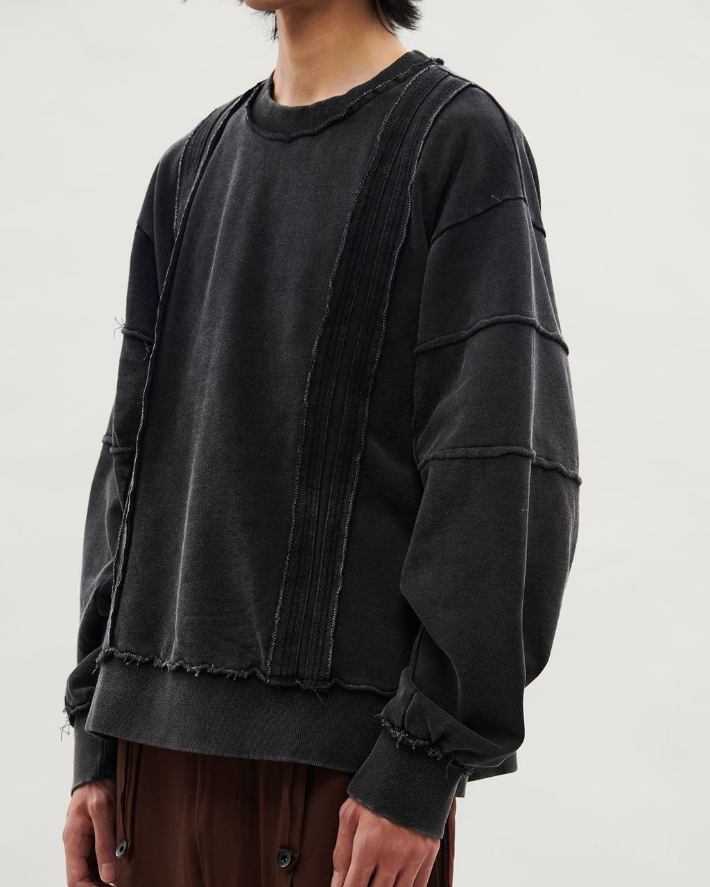 此款以 380g 重磅大絨布製成,正面兩側以外翻剪接線條結構,預留加長縫份並施以雙道裝飾壓線,邊緣保留毛邊細節,增添層次感。袖身採上下錯位拼接設計,讓袖子在著用比例上,營造整體視覺差異。