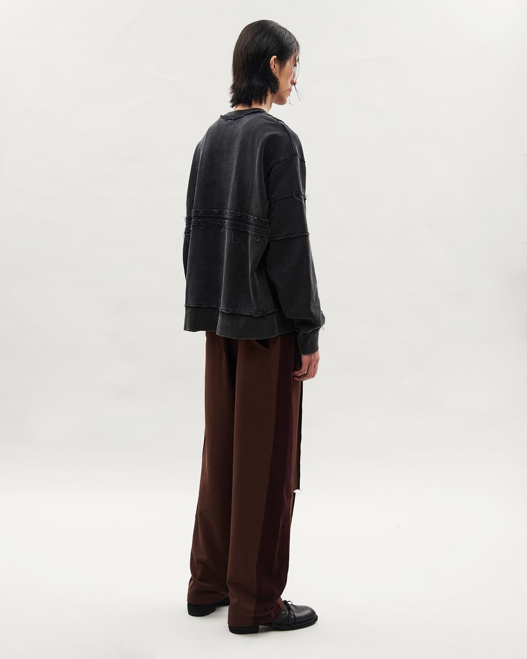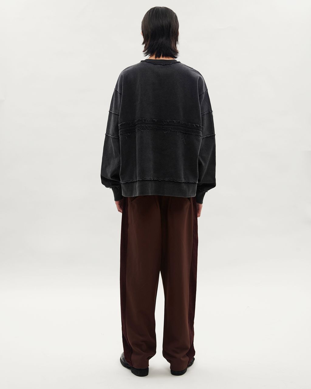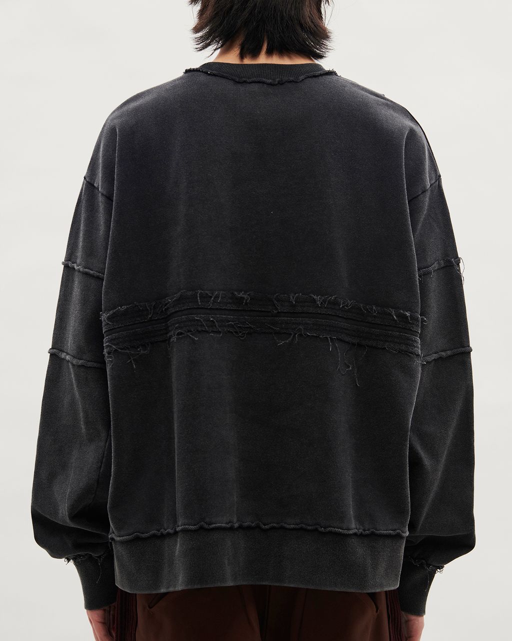 背部加入一道橫切的剪接線拼接,同樣以外翻縫份與雙道壓線呈現毛邊效果,呼應前身設計。