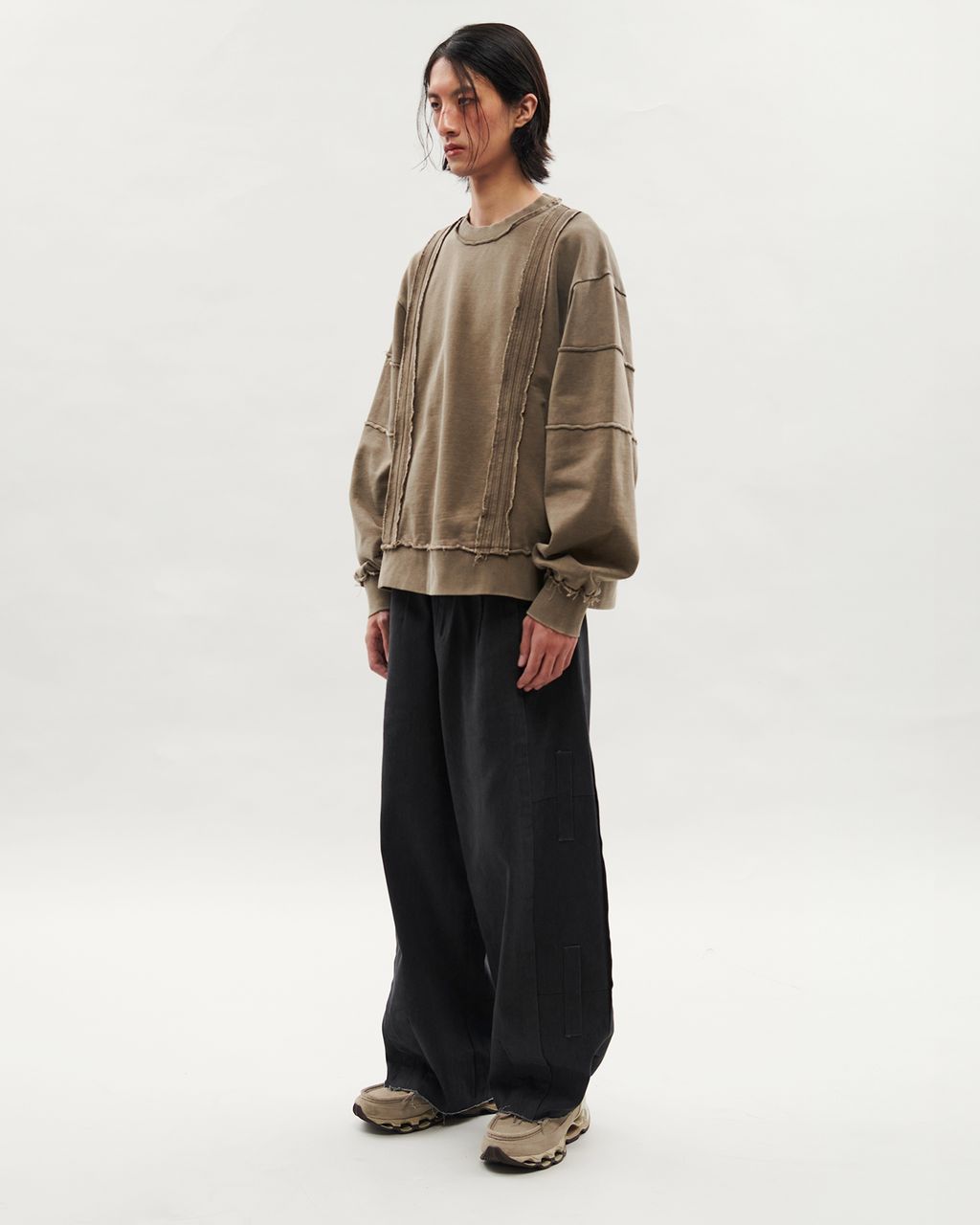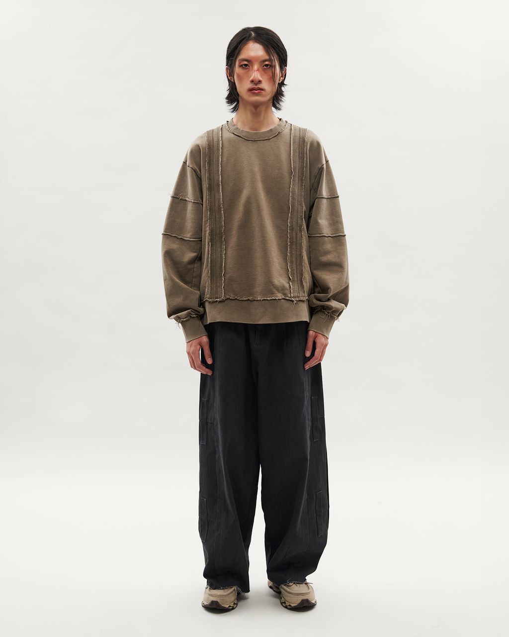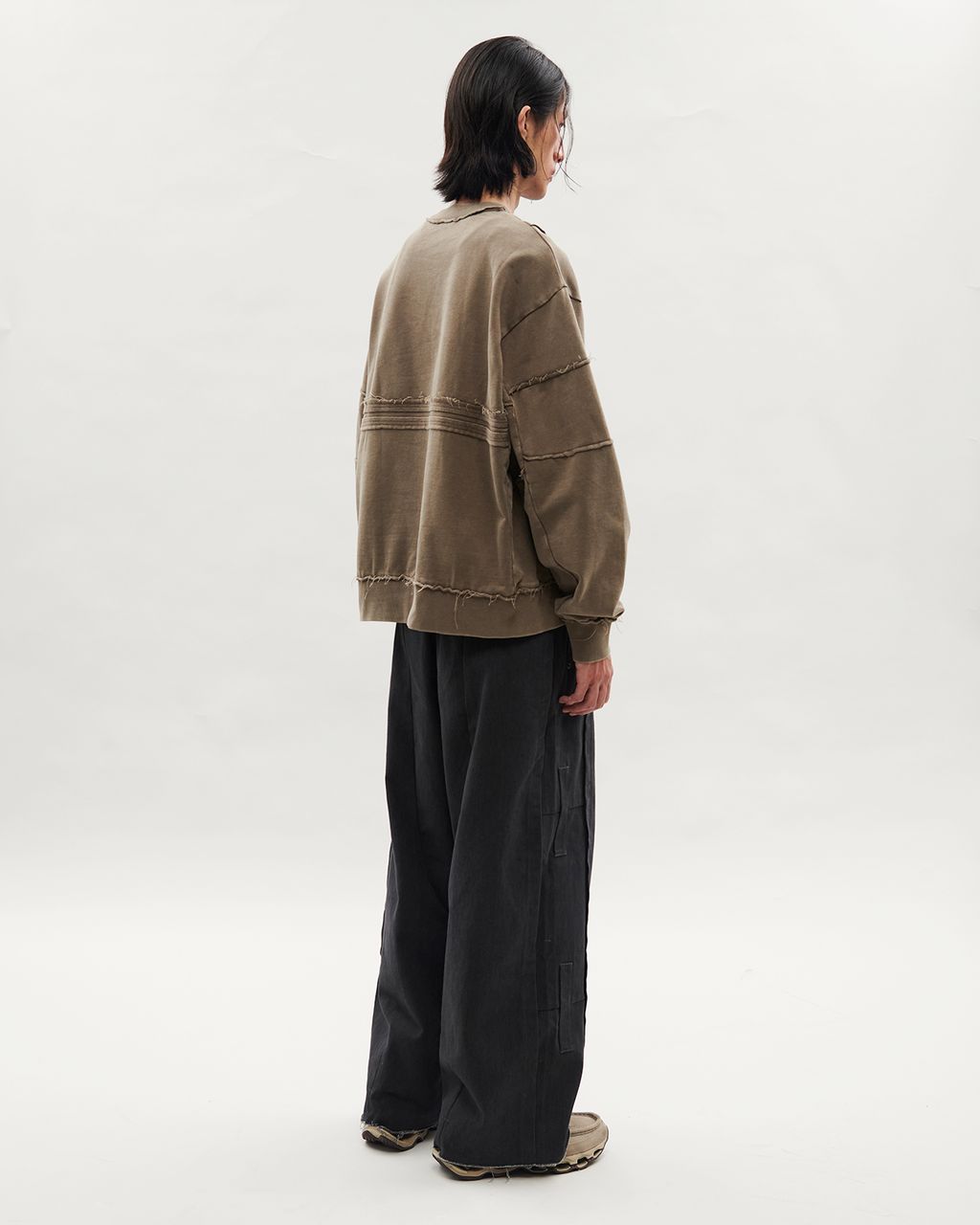 此款以 380g 重磅大絨布製成,正面兩側以外翻剪接線條結構,預留加長縫份並施以雙道裝飾壓線,邊緣保留毛邊細節,增添層次感。袖身採上下錯位拼接設計,讓袖子在著用比例上,營造整體視覺差異。