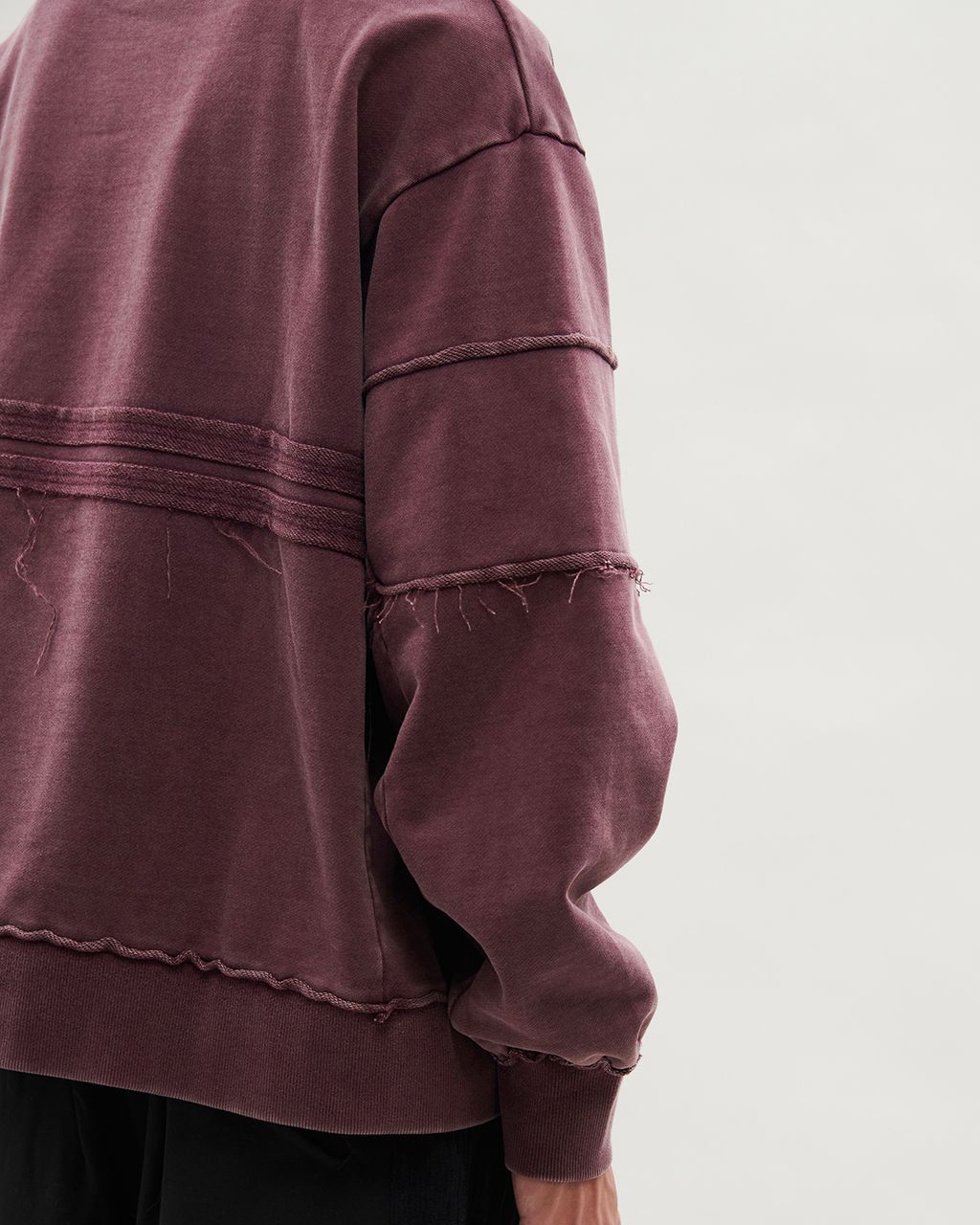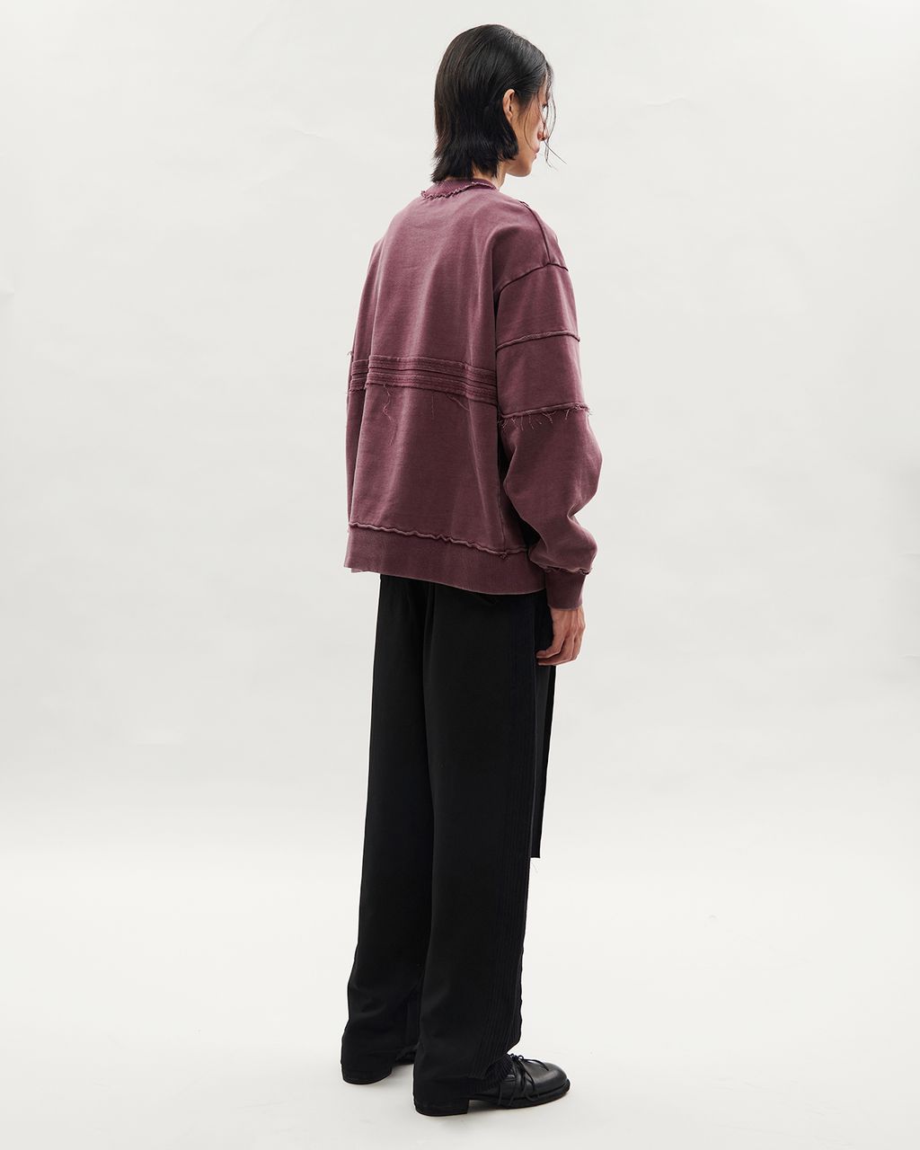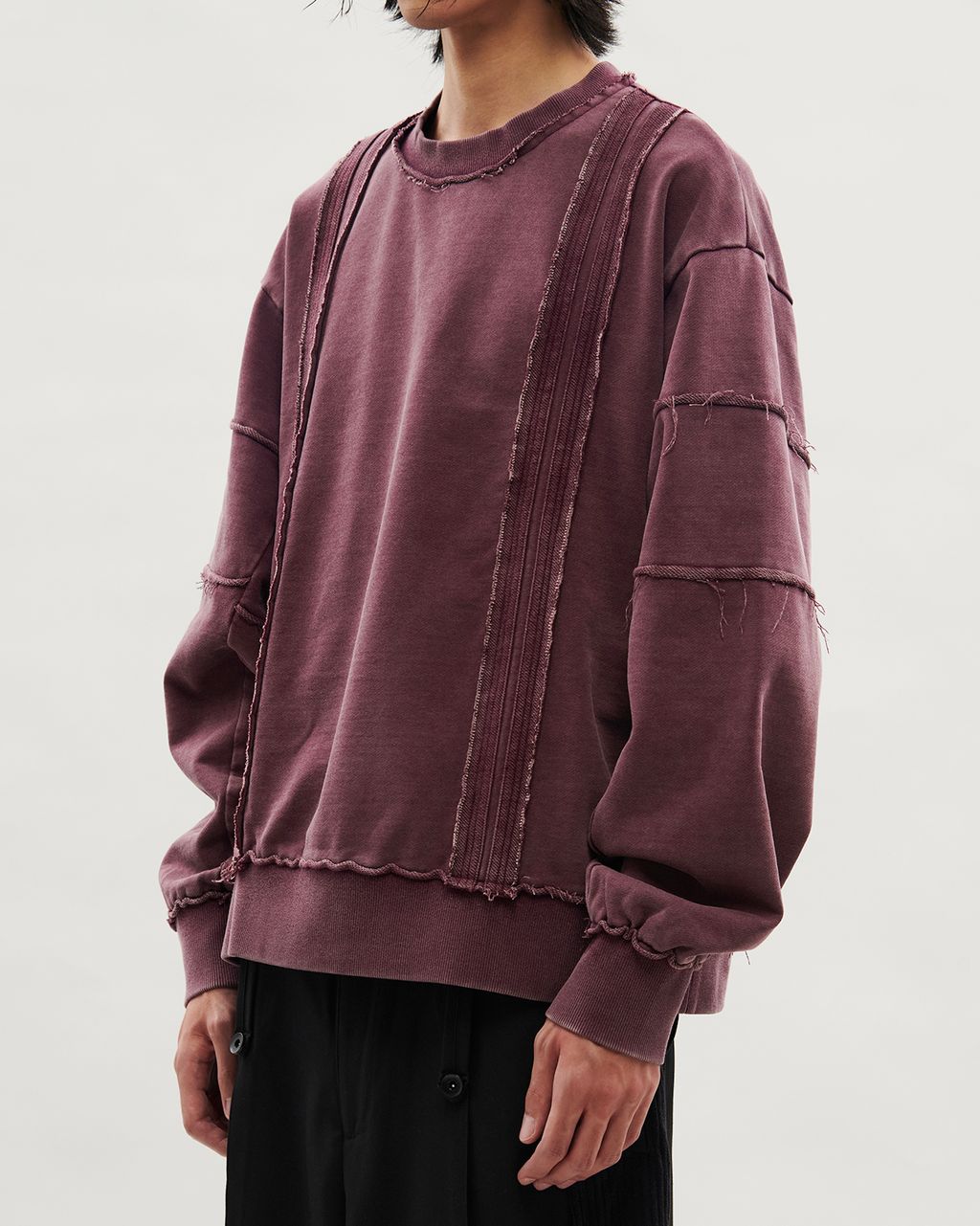 此款以 380g 重磅大絨布製成,正面兩側以外翻剪接線條結構,預留加長縫份並施以雙道裝飾壓線,邊緣保留毛邊細節,增添層次感。袖身採上下錯位拼接設計,讓袖子在著用比例上,營造整體視覺差異。