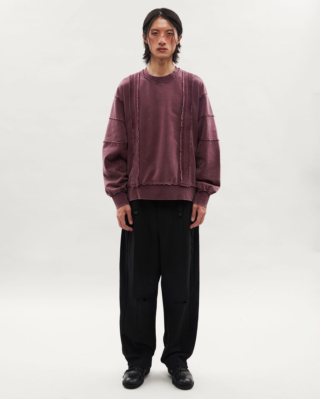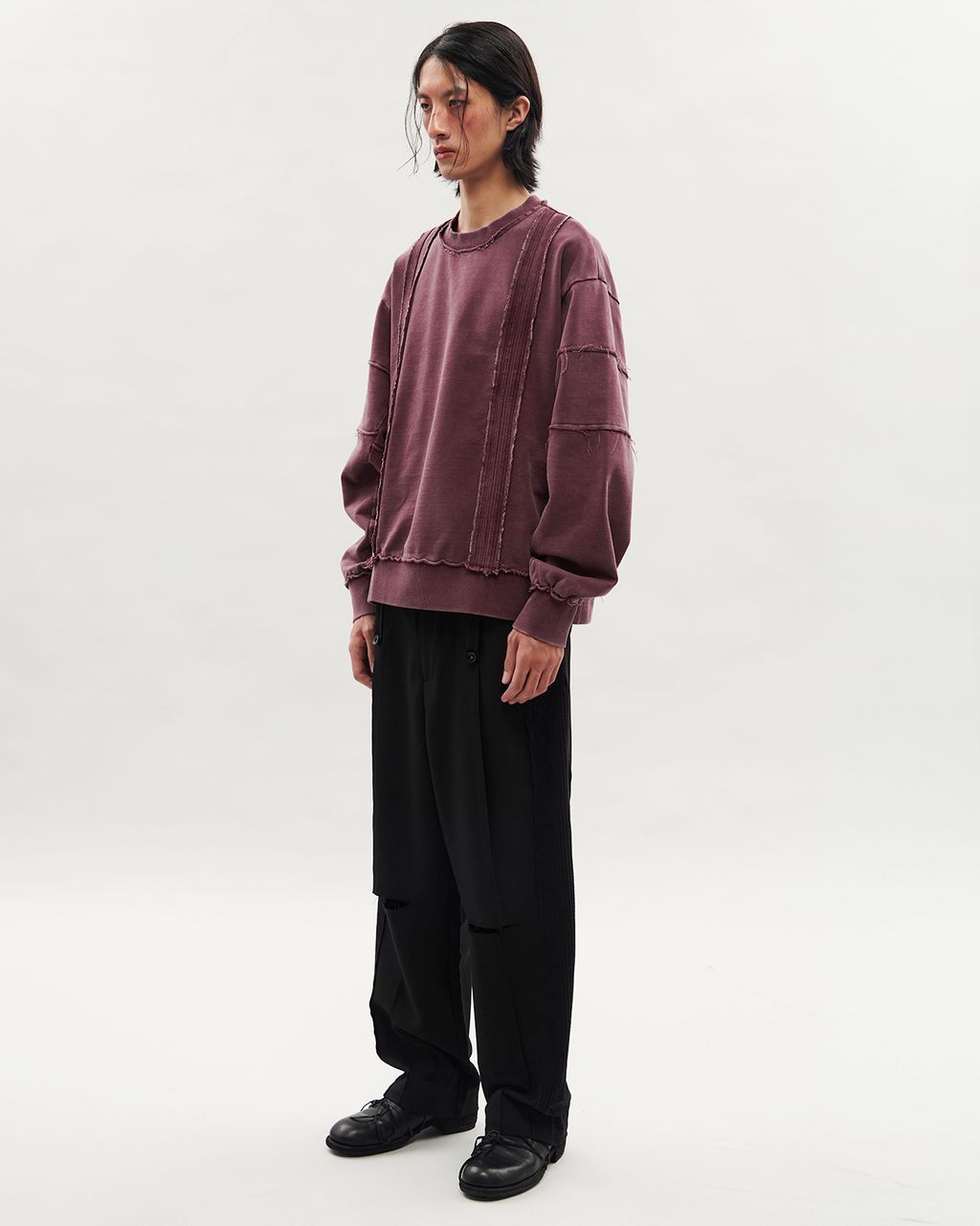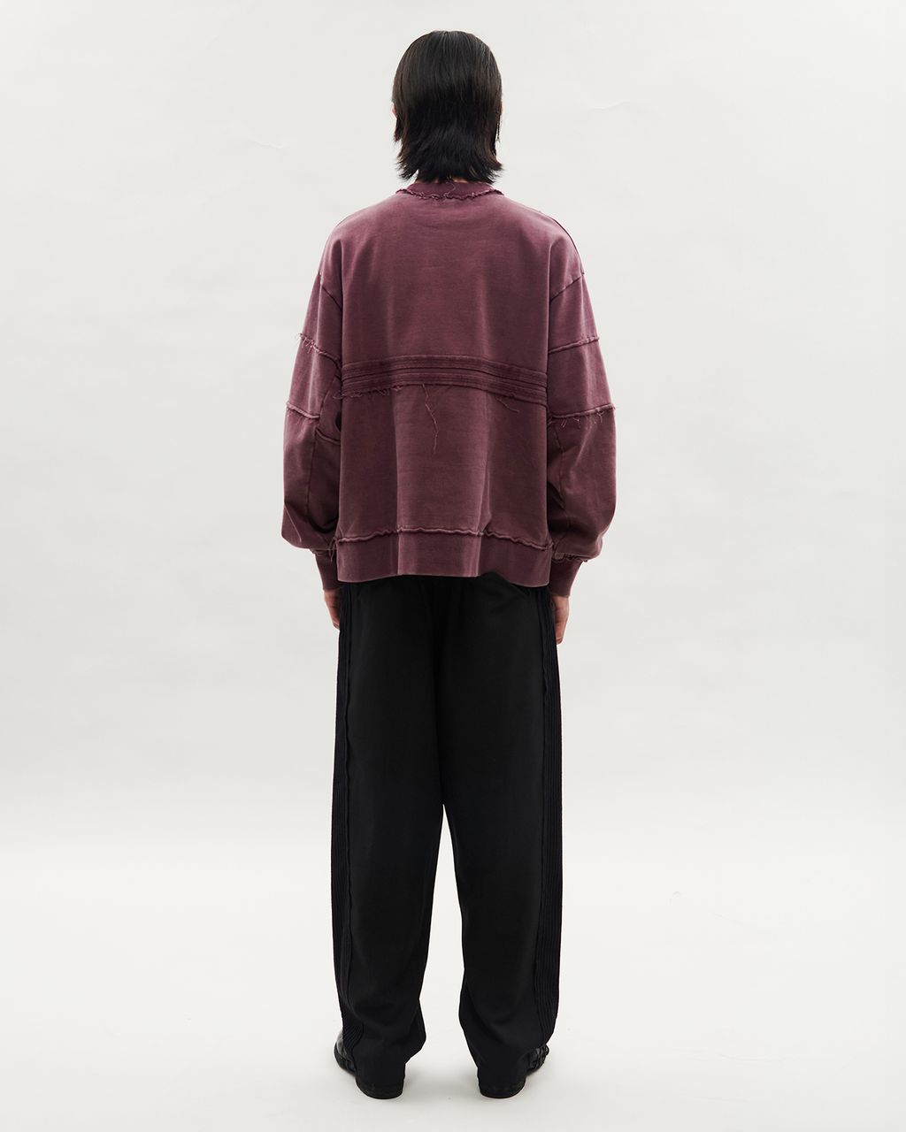 此款以 380g 重磅大絨布製成,正面兩側以外翻剪接線條結構,預留加長縫份並施以雙道裝飾壓線,邊緣保留毛邊細節,增添層次感。袖身採上下錯位拼接設計,讓袖子在著用比例上,營造整體視覺差異。