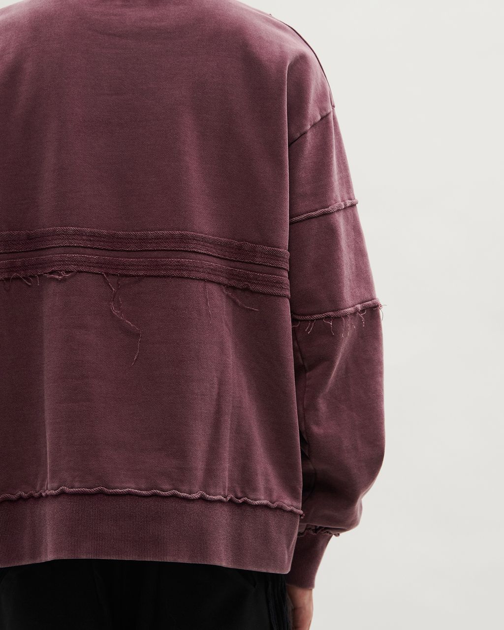 背部加入一道橫切的剪接線拼接,同樣以外翻縫份與雙道壓線呈現毛邊效果,呼應前身設計。